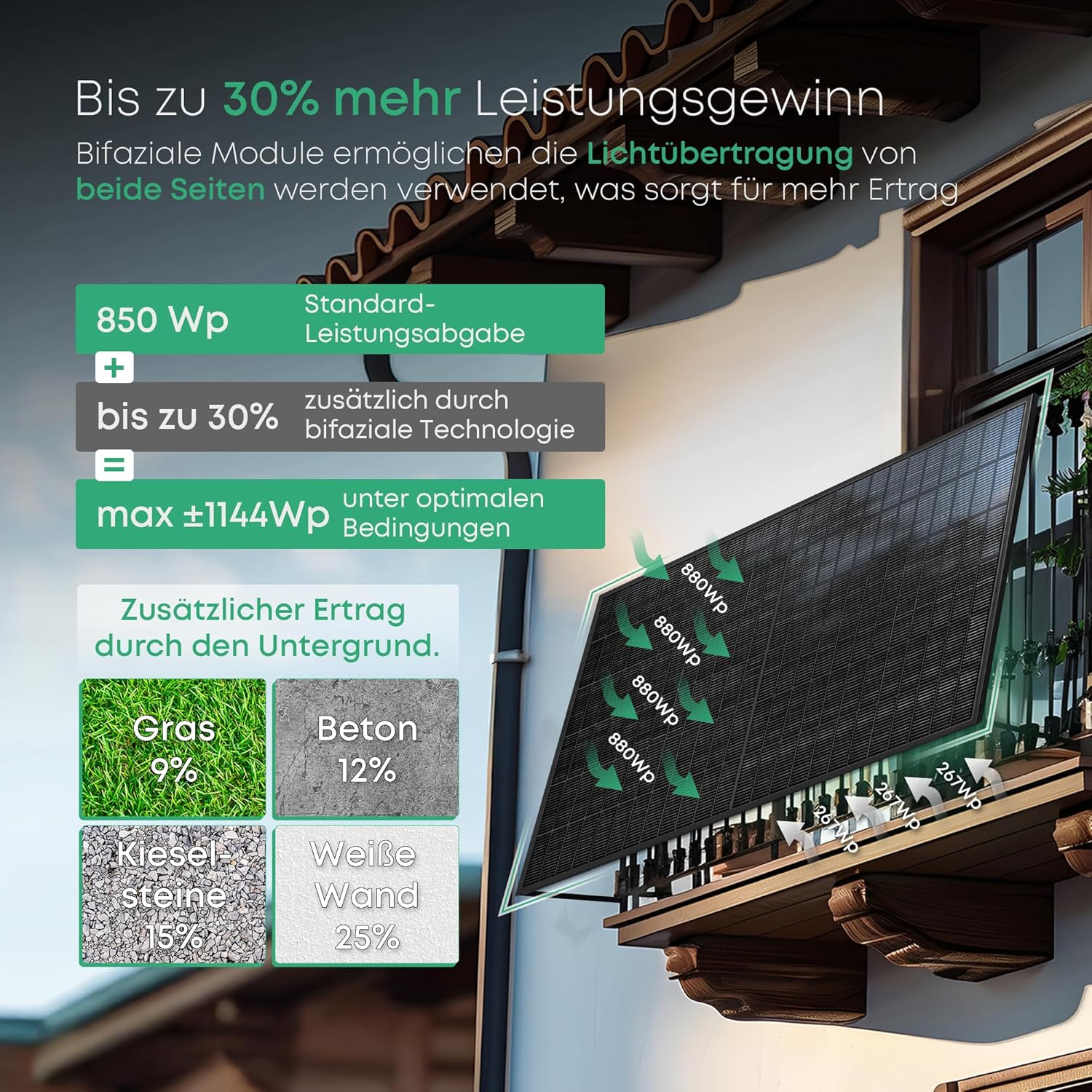 Deze zonnepanelen maken gebruik van bifaciale technologie, wat betekent dat ze zonlicht van beide zijden kunnen absorberen. Dit kan leiden tot een toename van de stroomproductie tot wel 25%! Dus of je nu een balkon, een tuinhuis of een plat dak hebt, dit systeem is perfect afgestemd op jouw ruimte.